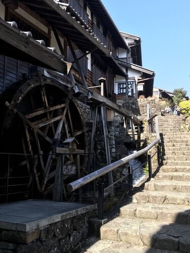 馬籠宿 水車小屋 (写真は2020年2月24日撮影) 2 馬籠宿 9時35分。定刻通りにバスは馬籠に着いた。駐車場は満車である。2月24日のコロナ自粛が高まりつつあったあの春先に来たときとはエライ違いである。宿場の入り口からして土産物屋と食い物屋が立ち…